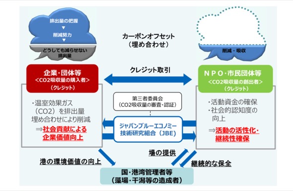 現在、ジャパンブルーエコノミー技術研究組合が「Jブルークレジット制度」を試行しており、2022年度の認証件数は21件、認証量は3,733トンに上り、一部のクレジットは取引も行われている。