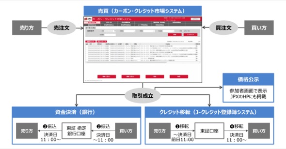 この「カーボン・クレジット市場」の市場設計としては、小口注文に対応するため1トン単位で売買可能として、注文は指値注文のみ、流動性がまだ低いと予想されることから約定は1日2回のみ(11:30、15:00)とした。