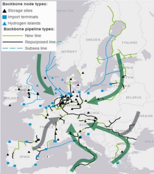 欧州では、域内での水素輸送や域外からの輸入を支えるインフラとして、2030年までに約28,000km、2040年までに約53,000kmの水素パイプラインを整備し、欧州全体で5つの水素供給・輸入回廊の形成を目指している。