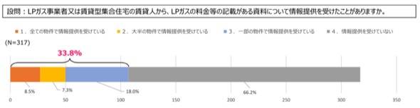 また国交省によるアンケート調査では、LPガス事業者等からLPガスの料金等の記載のある資料を受領したことがある割合は、不動産管理会社で33.8%、賃貸住宅オーナーで24.7%、宅地建物取引業者で19.1%であった。