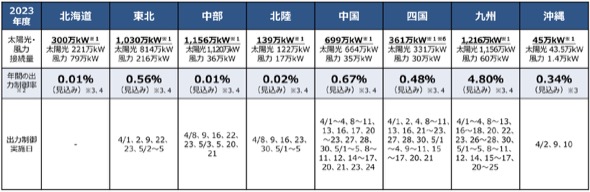 各エリア一般送配電事業者による2023年度の再エネ出力制御率の見通しは表2のとおりであり、九州エリアでは過去最高の4.8%が見込まれている。