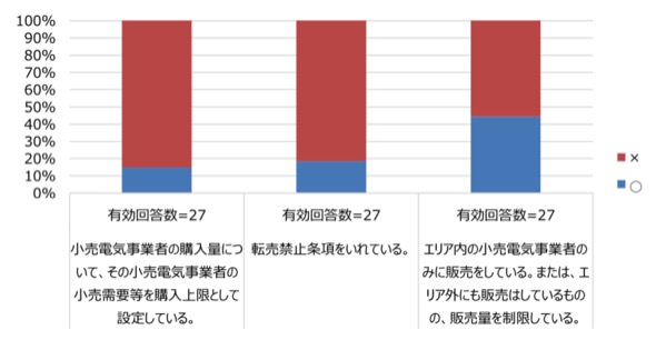 発電事業者に対するアンケートの結果、図5のように、購入上限や転売禁止条項を設ける事業者は少数との結果であった。なお、小売電気事業者に対するアンケート調査票には同じ設問が無いため、転売禁止等の条件のもとで契約する小売事業者がどの程度存在するかは不明である。このような事実確認については、売り手側・買い手側の回答を突合・比較するため、なるべく双方に同じ質問を設けることが望ましいと考えられる。