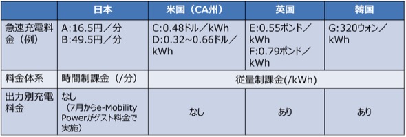 現在日本では、充電時間に応じた課金(/分)(時間制料金)が主流であるのに対し、諸外国では、充電した電力量に応じた課金(/kWh)(従量制課金)が主流となっている。