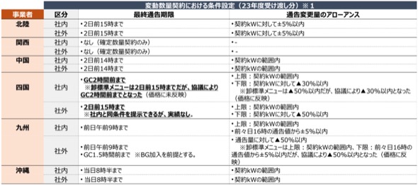 四国電力は、現時点、社外小売事業者からのニーズがないものの、社外事業者も希望すれば社内と同一の通告変更期限を選択可能であると回答している。