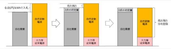 FIT特例1を使用する小売電気事業者は、一般送配電事業者から通知された値を用いて発電計画を作成するが、太陽光の供給過多(余剰)時には、JEPXスポット市場の最低入札価格である0.01円/kWhで売り入札したとしても、売れ残る可能性がある。