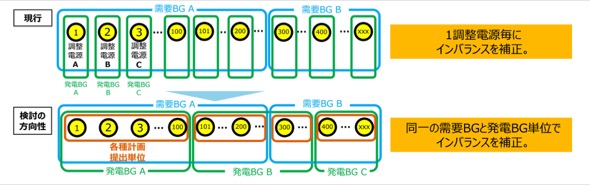 また現行制度(つまり高圧以上)では、受電点からの逆潮流で需給調整市場に参画するためには、発電計画との差分を調整力供出量とみなして、インバランス補正を行うため、原則として逆潮流1カ所ごと(1需要地点ごと)に1つの発電BG(=「調整電源BG」)を組成する必要があり、アグリゲーターは発電BGごとに発電販売計画や基準値計画を作成する。