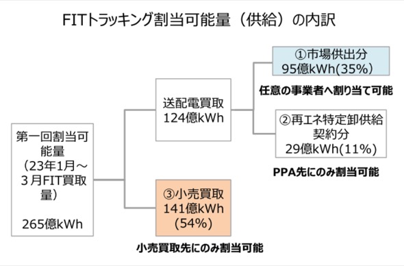 よって、小売買取または特定卸供給の対象となっているFIT電源のトラッキング情報は、当該小売買取義務者または特定卸供給者に対してのみ付与されている。これら2つの存在により、希望する小売事業者へ任意にトラッキング情報を割当可能な量は、FIT証書全体の35%に留まっている。