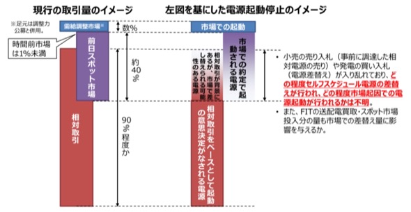 近年、JEPXスポット市場の取引量が増加しているものの、相対取引量も多いため、純粋な市場取引量は1割程度と推測されている。よって、同時市場の開始後も、相対取引電源の多くがセルフスケジュール電源として、相対取引をベースとした起動の意思決定が行われると予想される。ただし、セルフスケジュール電源の限界費用が市場価格より高い場合、発電事業者による市場での経済差し替えのニーズ等があると考えられる。