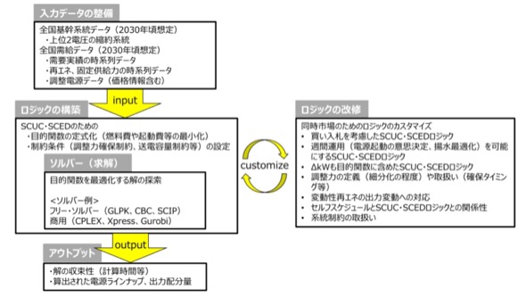電源起動・出力配分ロジックの検証シミュレーションには、電力中央研究所のプログラムを使用することとしており、電源運用と系統運用(送電容量)に関する制約を考慮し、供給力と調整力に対する需要に見合った、最も経済的な需給運用計画(≒電源運用スケジュール)を立案することが可能である。