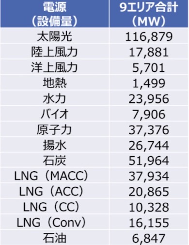 需要データ、電源データのいずれも2030年を想定し、9エリア合計の電源設備量は表1のとおりである。(MACC:1500℃級コンバインドサイクル、ACC:改良型コンバインドサイクル、CC:コンバインドサイクル、Conv:従来型)