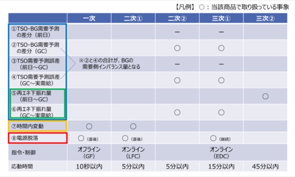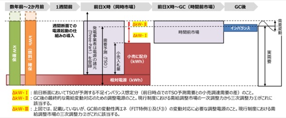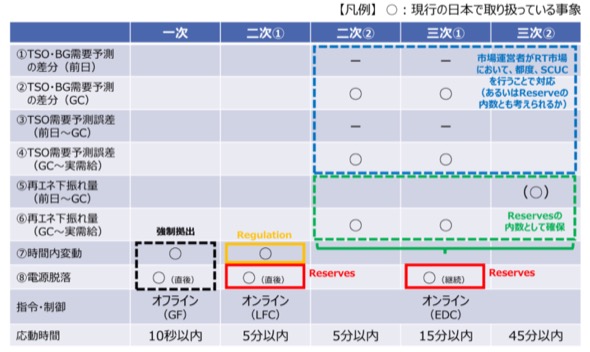 まず日本では、計画値同時同量制度のもと、GC(実需給の1時間前)までは小売電気事業者が自身の需要予測(需要計画)に一致させるよう、必要な供給力を確保することが求められている。よって、送配電事業者が調達する「調整力」とは原則、GC「以降」の予測誤差や時間内変動、電源脱落に対応する分を意味する。ただし、FIT特例①や特例③が存在するため、計画時点からGCまでのFIT再エネ発電予測誤差に対応する分も、調整力と呼ばれている。