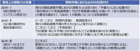 これらの検討を踏まえ、同時市場における調整力の定義(ΔkW-I、II、III)は、表3のように再整理された。