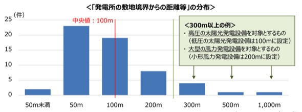また「一定距離」については、自治体条例の定量基準等を参考として、低圧の電源では100m、特別高圧・高圧では300m、環境アセス(法アセス)の対象電源は1km、とした。