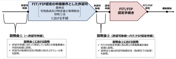 再エネ特措法では、発電設備の設置場所や規模を確定させた上で、FIT/FIP認定を申請するというフローが基本であり、説明会における住民からの質問等を踏まえて、事業者が対応を検討するための十分な期間を確保することも必要となる。