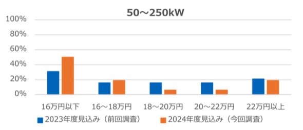 まず、地上設置太陽光を規模別に見た場合、50kW〜2MW未満では前年度調査と比較して「16万円以下」が増えて、コスト低減傾向にある一方、10〜50kW未満、及び2MW以上では、明確なコスト低減傾向が見られない。