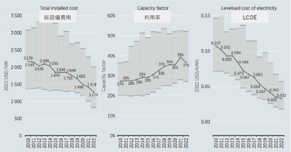 世界の陸上風力発電は、設備コストの低下や設備利用率の上昇によりLCOE(均等化発電原価)の低下が進むことにより、累積導入容量(kW)は2010年から2022年の間に約5倍に拡大してきた。