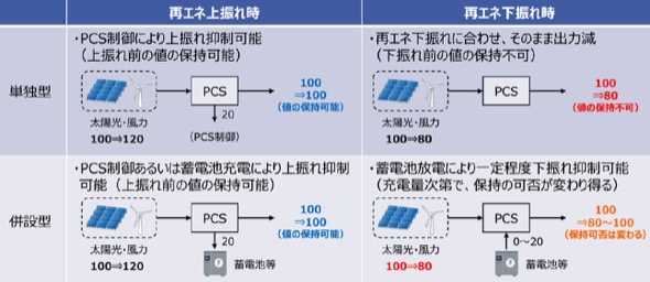 「FIP電源等」(FIT特例②・FIP・非FIT)には、同時同量達成義務やインバランスリスクが存在するため、FIP電源等の設備形態としては、太陽光・風力発電設備のみで構成される「単独型」と、蓄電池等が併設される「併設型」の2タイプが想定される。