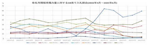 電力・ガス取引監視等委員会では、これまで継続的に、グロス・ビディング等の自主的取組をモニタリングしてきており、2023年6月時点での旧一電各社の販売電力量に対するグロス・ビディング売り入札量の割合は、一部事業者を除き概ね横ばいで推移していることが報告されてきた。