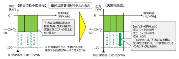 需要のタイムシフトを行うタイプの上げDRでは、供給余剰(スポット価格が0.01円/kWh)の時間帯(コマ)では、市場調達することが経済合理的である。それにも関わらず、供給余剰時に上げDRが需給調整市場へ下げΔkWを応札するためには、経済合理的でない行動、すなわち市場調達を行わないことが想定されるが、無駄な余剰インバランスの発生など、望ましくない結果に繋がると考えられる。