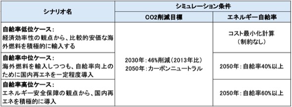 デロイトトーマツコンサルティングでは、エネルギーシミュレーションツール「TIMES」を用いて、2050年カーボンニュートラルの実現を前提として、エネルギー自給率を分岐要素としたシナリオを想定し、将来の電力需要を推計している。デロイトが想定した3つのシナリオとシミュレーション条件は表2のとおりである。