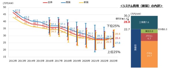 住宅用太陽光発電のシステム費用はこれまで低減傾向であったが、2023年設置の平均値は28.8万円/kWであり、2022年設置より1.9万円/kW(6.9%)増加した。平均値の内訳は、太陽光パネルが51%、工事費が26%を占めている。