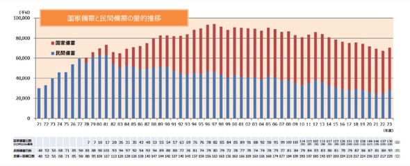 これまでの国家備蓄と民間備蓄の量的推移は図3のとおりである。