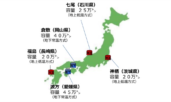 日本の石油ガス(LPガス)備蓄は、①国が保有する「国家備蓄」と、②石油備蓄法に基づきLPガス輸入業者が義務として保有する「民間備蓄」で構成されており、2023年8月末時点の備蓄量は、国家備蓄:139万トン(53日分)、民間備蓄:205万トン(73日分)である。LPガス国家備蓄基地は図5の5カ所で、合計150万トンの容量である。