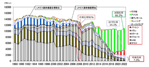 なおLPガスについては、近年、アメリカやカナダからの輸入が増加していることに伴い、中東依存度は、ピークの2007年度91%から2022年度には約7%に低下している。