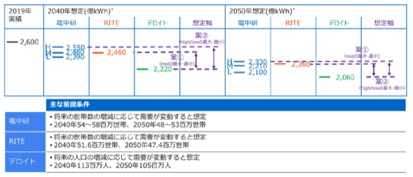 「技術検討会社」3者による家庭部門の基礎的需要に関する将来想定は、各社の前提条件の違いがあるものの、一定の幅に収斂する結果となった。