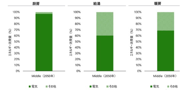 家庭部門での電化は、暖房や給湯、厨房などの熱需要について、ヒートポンプやIH技術による電化が想定される。