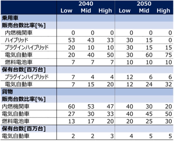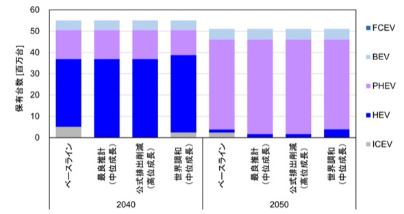 他方、RITEのモデル分析では、2050年時点でもプラグインハイブリッド車(PHEV)が最多を占めている。これは、モデル分析の前提条件として、PHEVがBEVよりも低価格であるためと考えられる。
