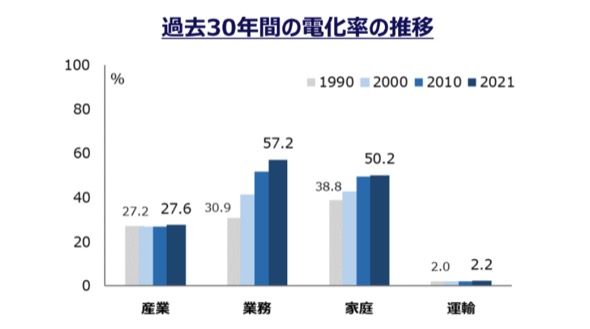 過去30年程度で、家庭部門や業務部門においては電化率が上昇しているものの、産業部門ではほぼ横ばいが続いている。(図7の「運輸」は道路交通部門に限る)
