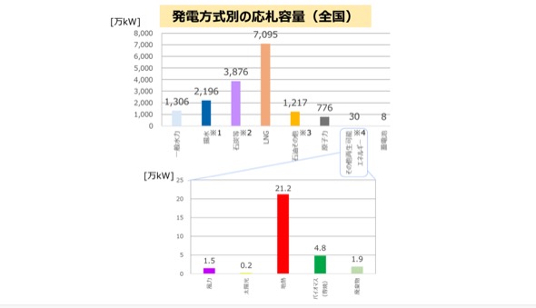 全国の発電方式別の応札容量(ただし、変動電源(アグリゲート)等を除く)を見ると、一般水力は1,306万kW(7.9%)、揚水は2,196万kW(13.3%)、石炭等は3,876万kW (23.5%)、LNGは7,095万kW(43.0%)、石油その他は1,217万kW(7.4%)、原子力は776万kW(4.7%)、その他再エネは30万kW(0.2%)、蓄電池は8万kW(0.05%)であった。石炭等のうち、非効率石炭火力の応札容量は635万kW(3.8%)である。