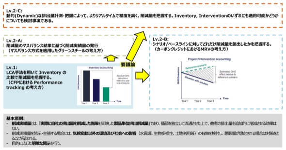 研究会では、今後「削減実績量(仮称)」を国際的に訴求可能な指標としていくため、基本原則やLCA的手法について、整理している。