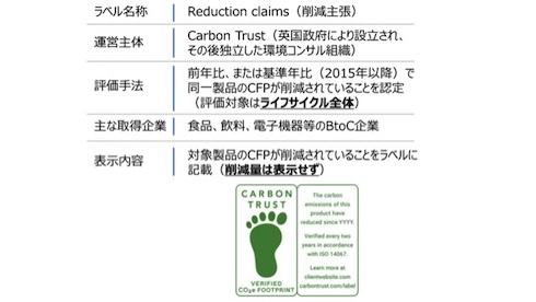 また、「削減実績量(仮称)」を国内外で広く訴求していくためには、分かりやすいビジュアルなラベルやマークを設けることも有効と考えられる。英国Carbon Trustによる「Reduction claims(削減主張)」ラベルのように、「最終製品の削減割合を表すラベル」等は、国内外で既に幾つか存在しており、これらの先行事例を参考としながら、一定の指針や基準を日本主導で整備していくことが重要と考えられる。