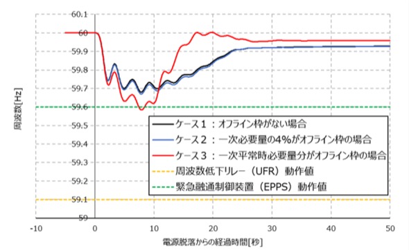 また「中西エリア」では、図7のケース3(一次平常時必要量全量がオフライン枠)は、ケース1(オフライン枠がゼロ)やケース2(一次必要量4%がオフライン枠)と比較すると、周波数回復が遅く、緊急融通制御装置(EPPS)が動作したものの、全ケースにおいて周波数は問題なく回復することが確認された。