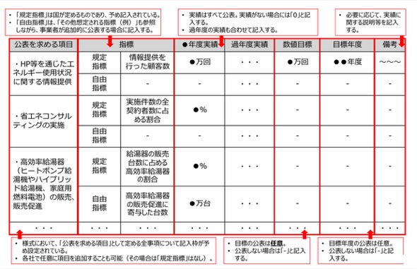 新たな制度では、国は、小売事業者が公表すべき一般消費者の省エネ等に資する取り組みについて、公表を求める項目の一覧、項目毎に国が定める指標(規定指標)、事業者が追加的に自由指標を定める場合に参考とする指標(その他想定される指標例)を定める。