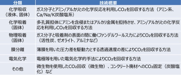CO2の回収方式には複数の技術があり、すでに商用化されている化学吸収や化学吸着のほかに、膜分離や電気化学を用いた手法が開発中である。