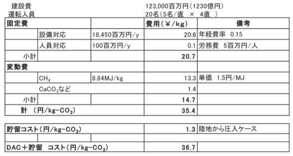 科学技術振興機構低炭素社会戦略センターの試算によれば、DACのコストは35,400円/t-CO2、DACCSとして36,700円/t-CO2と試算されている。大気中の希薄なCO2を回収するために多くのエネルギー(熱・電気)を消費するため、運用コスト及びCO2除去効果の観点から、エネルギー消費の削減が重要となる。