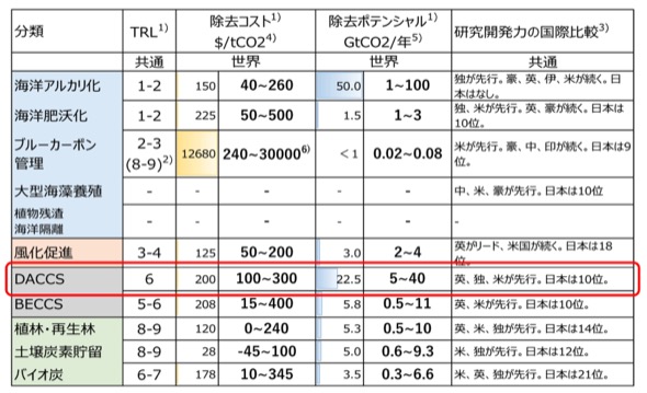 DAC・DACCSを、「1.TRL(技術成熟度レベル)」「2.除去コスト(2050年想定の中央値)」「3.除去ポテンシャル(2050年想定の中央値)」「4.研究開発力の国際比較」の観点から、他のNETsと比較したものが表3である。