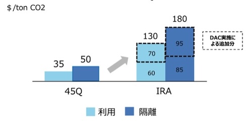 米国やEU等の諸外国では、官民の双方で、DAC等を含むNETsに対する取り組みや支援政策が進んでいる。米国は、CO2除去(CDR)の実施コストを100ドル/トン以下とする目標を表明しており、米国内における4つの「DAC Hub」設置に対して35億ドルの投資を行い、年間100万トン以上のCO2の回収・貯留・製品転換ポテンシャルのある技術を実証、商用化することを目指している。また、インフレ削減法案(IRA)において既存のCCSタックスクレジットを拡大し、DACに関する特別措置の追加により、1トン当たり最大180ドルが税額控除される。