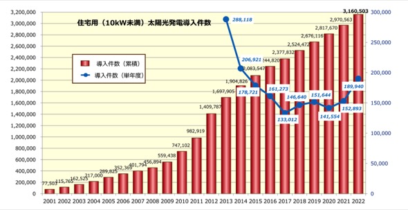 国は第6次エネルギー基本計画において、「2030年において新築戸建て住宅の6割に太陽光発電設備が設置されることを目指す」とする政策目標を設定しているが、2022年度の新築戸建住宅の太陽光発電設備設置率は31.4%に留まる。