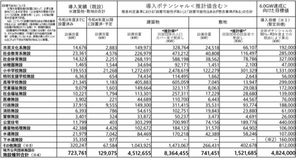 環境省はこの目標実現に向けて、政府保有施設における導入目標を0.06GW(57MW)、地方公共団体保有施設における導入目標を約4.8GW(表5)、その他の追加的な取り組みにより、2030年度までに公共部門合計で6.0GWの導入を目指す新たな目標を設定した。