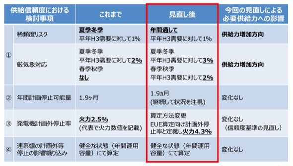 しかし近年、電力の需給逼迫等が続いたことから、適切な供給力を確保するため、供給信頼度評価の算定諸元の見直しや精緻化が行われた。