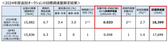以上の考え方に基づき、最新諸元を用いて算定した2024年度追加オークション(対象実需給年度:2025年度)における目標停電量は0.033kWh/kW・年となり、目標調達量は1億8,399万kWとなった。