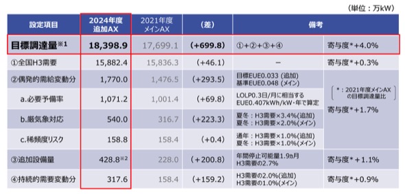 2021年度メインオークション(AX)と比較すると、需要想定や厳気象対応、計画停止に対応する追加設備量等、すべての設定項目において増加していることが分かる。