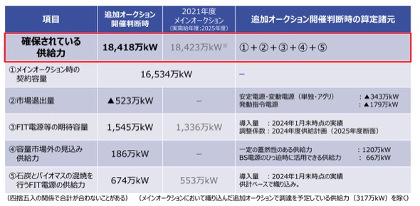 そのほか表8のように、③FIT電源等の期待容量の増加、④容量市場外の見込み供給力、⑤石炭とバイオマスの混焼を行うFIT電源の供給力を足し上げると、現時点確保されている2025年度供給力は1億8,418万kWとなった。これは、2021年メインオークション時点の供給力と比べ5万kWの減少である。