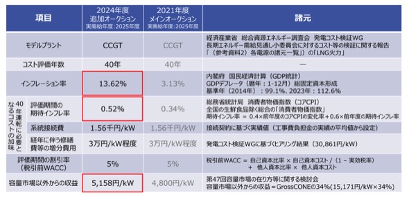 最新の諸元をもとに算定すると、2024年度追加オークションのGross CONEは15,171円/kW、他市場収益は5,158円/kWとなり、Net CONEは10,013円/kW となった。これは、2021年度メインオークションで算定されたNet CONE(9,372円/kW)と比較すると641円/kW(6.8%)の上昇となっている。また、需要曲線における上限価格はNet CONEの1.5倍と機械的に設定されるため、15,019.5円/kWとなった。