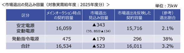 供給力の減少要因の一つが、容量市場からの退出である。2021年度メインオークション(対象実需給年度:2025年度)で落札し、一旦、容量確保契約を締結した電源の1億6,534万kW(165,342,148kW)のうち、安定電源や変動電源の市場退出量は、約343万kWである。このうち、ブラックスタート機能(BS機能)公募の契約電源(揚水発電等)は、容量市場の契約容量と重複する部分について、容量市場から部分退出することと整理されたことにより、約134万kWが退出している。