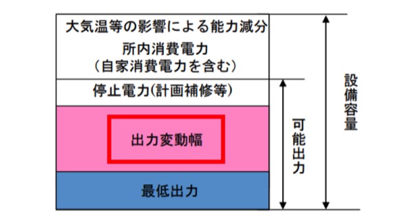 変動性再エネ電源の増加に伴い、調整力の重要性が高まっているほか、2024年度から需給調整市場が全面運開することから、供給計画においても2024年度から、調整機能を有する発電事業者等に対して、調整能力の報告を求めるよう供給計画の様式が変更された。調整能力には様々な定義があり得るが、供給計画では、一般送配電事業者からオンライン制御が可能な設備の場合は、出力変動幅(図5の赤枠部分)を報告する。
